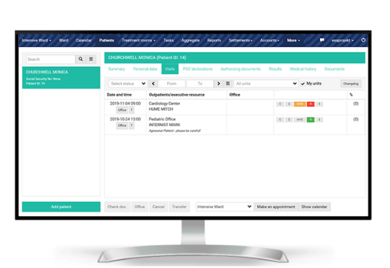 A module that facilitates the management of patient registration for visits by, among others: viewing work schedules, advanced search for available dates, searching for patients according to specific criteria or cancelling a visit giving a reason. Ensures efficient practice management by viewing the list of appointments, recording the diagnosis and treatment items made to the patient, convenient handling of standard documents: visit cards, patient statements, and referrals.