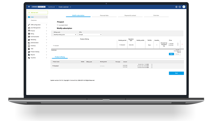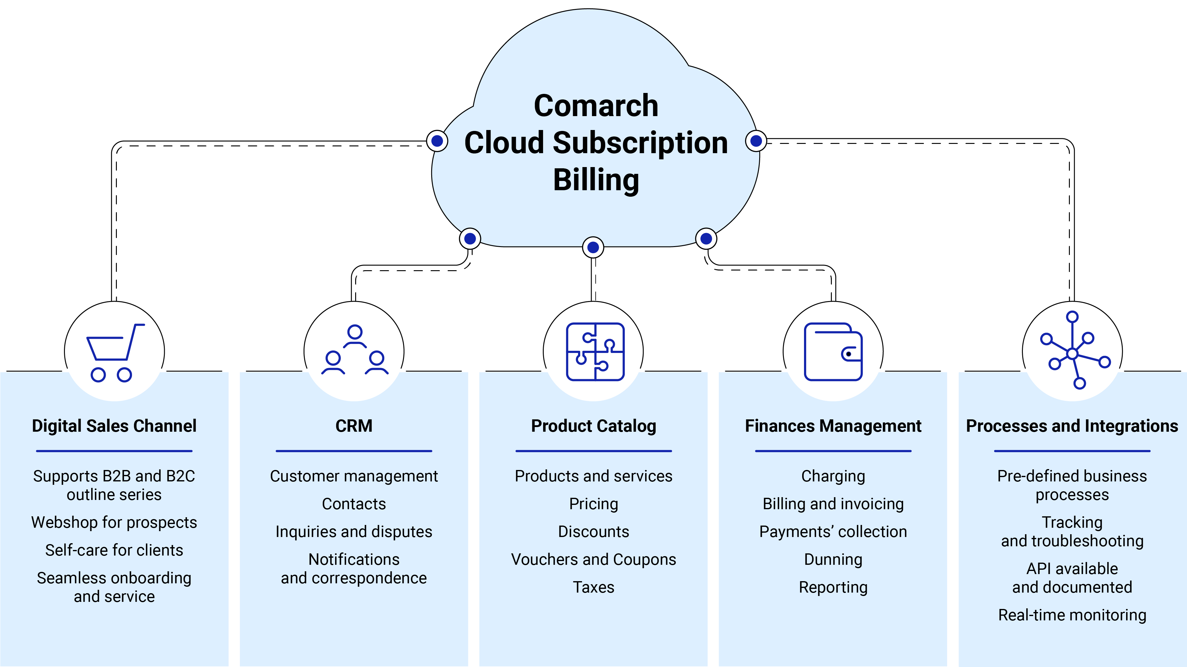 Comarch Cloud Subscription Billing enables simple management of customers, their contracts, recurring billing and related processes for subscription-based businesses. The available SaaS platform types offer you a large variety of features, adjusted to each company’s individual needs and those of their business clients.