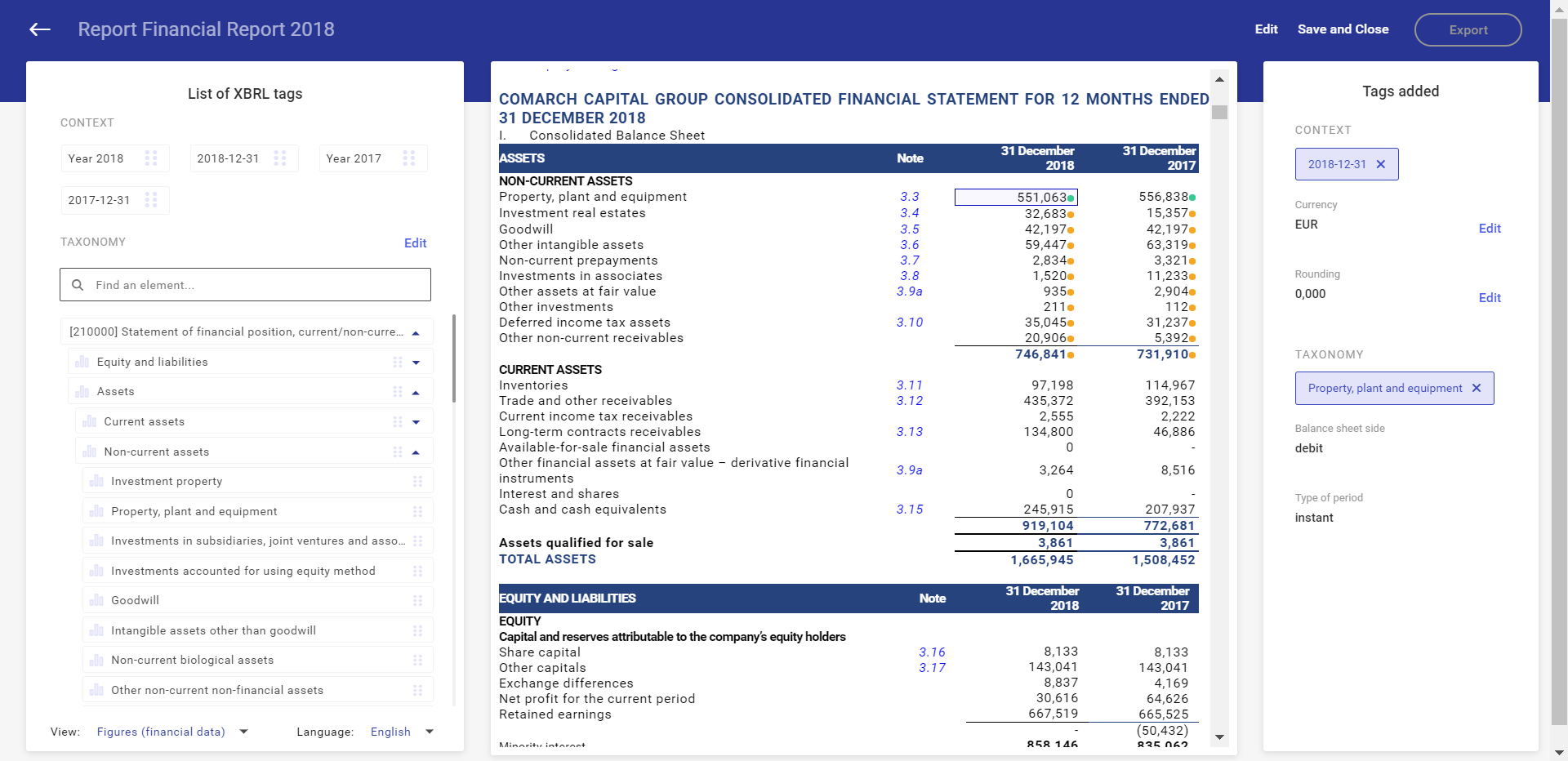 The software has a built-in set of the latest ESEF taxonomy tags, a glossary of terms used to mark data in XBRL reports. They can be assigned to data in the financial statements, and the dictionary itself can be easily supplemented with new extensions. Additionally, the report can be searched in an intuitive way using the taxonomy tree.