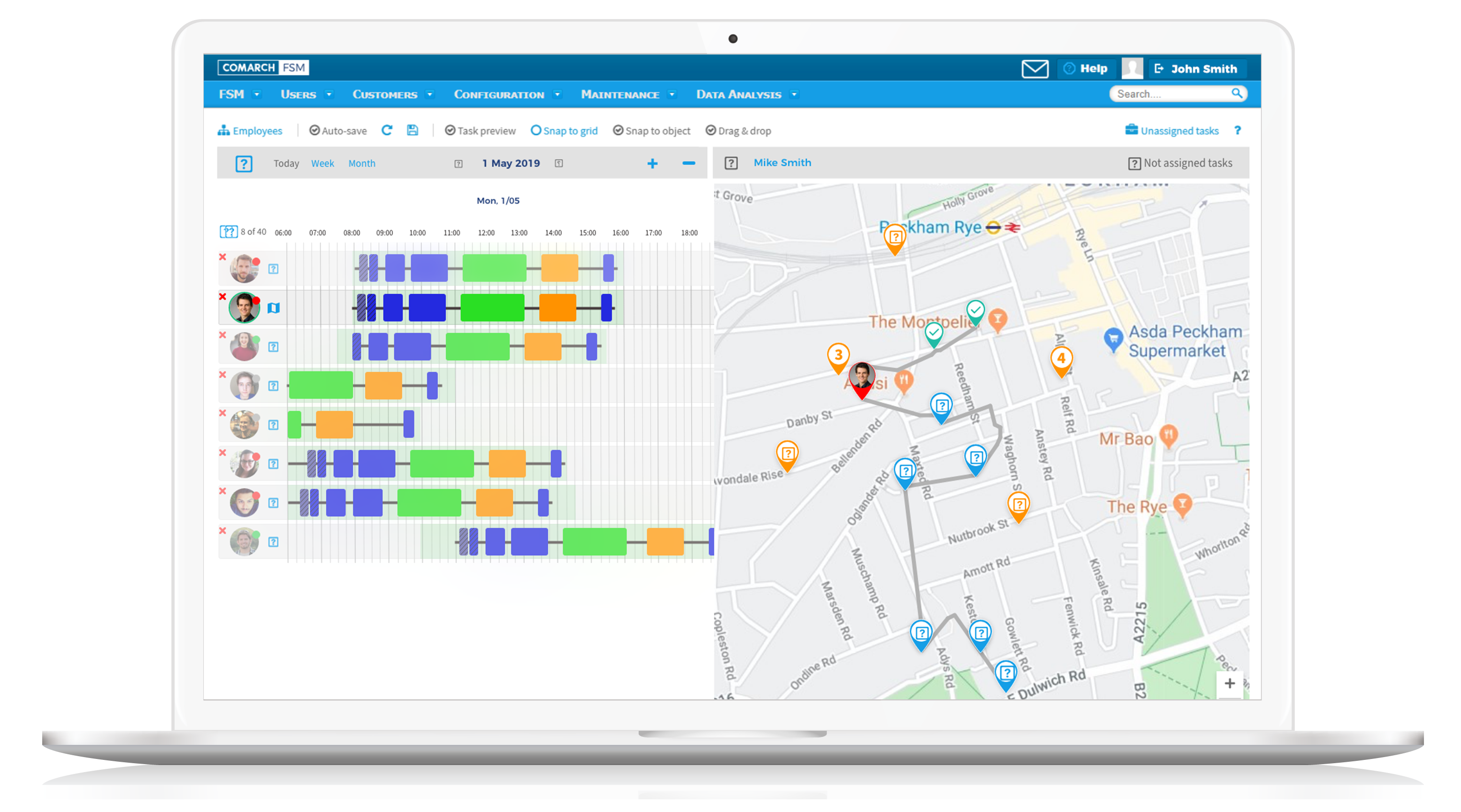 By continuous monitoring of insurance claims handling you can always find room for improvement. Comarch FSM includes an extremely useful feature allowing you to arrange an audit relating to a given claim case or employee. You also have the possibility to send a survey to clients to verify the quality of the service they received. Additionally, all the data collected for the purposes of visit management may be used in the form of dashboards available in the Comarch FSM app and Comarch BI Point, or integrated with existing business intelligence software from a third-party. Measure adjusters’ daily, weekly or monthly performance in real time, assess compliance with service level agreements, and see how KPIs improve as manual work is cut thanks to Comarch FSM.