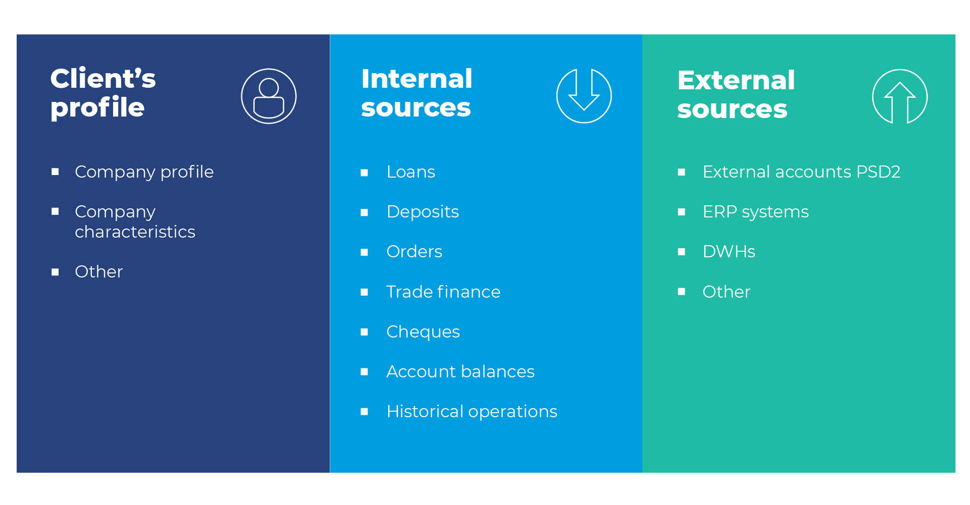 Run an analysis of internal sources like loans, deposits, orders, trade finance, cheques, operation history and balances, combined with an external ERP. This will let you predict customer liquidity and help them keep it by offering suitable products.
