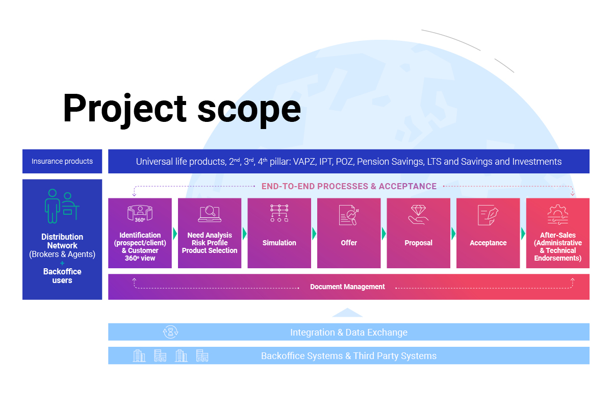 PROJECT SCOPE: Implementation of a comprehensive front-office solution covering pre-sales, new business and after-sales processes for life & pension insurance to speed up client service. It is also a collaborative tool for distributors (brokers, agents) and back-office employees to perform processes end-to-end.