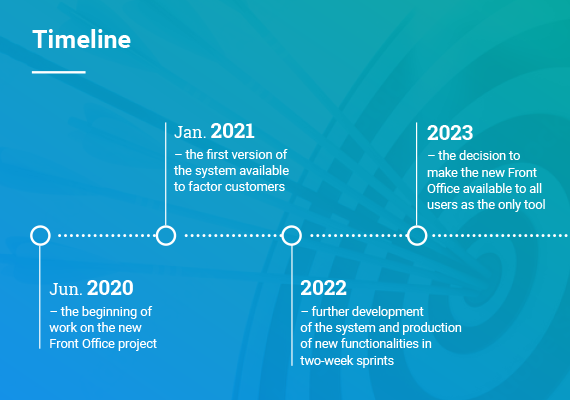 The key objective of the project was to provide end users with a modern application – Front Office 2.0, designed using the latest UI/UX trends, addressing all the needs of modern entrepreneurs using factoring products.