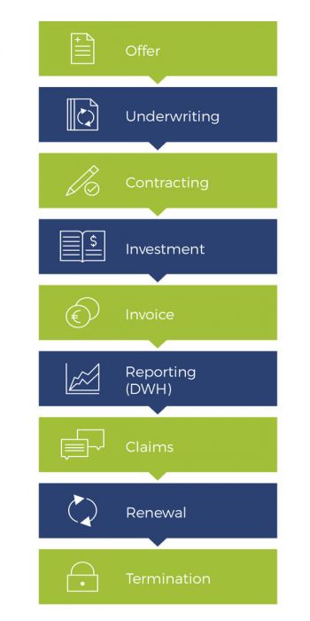 The comprehensive system supporting individual and group life insurance. The solution allows efficient management of all parts of insurance business, including product definition, offer presentation, underwriting, policy operations, claim processing, fund management, billing and collection, technical provisions and reserves, calculations and reporting.