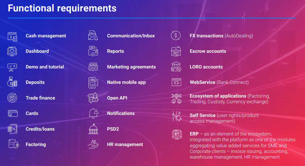 From the beginning, the RFP published by the bank was a very complex endeavor – the client wanted to revolutionize the Polish banking scene by introducing a comprehensive ecosystem of solutions addressed at its SME and Corporate clients. Focused not only on revamping of their current digital banking system, the aim was to integrate multiple value added services into the platform which would become a single point of digital contact for smaller and larger companies alike, providing not only banking products but also additional features, such as invoicing and accounting, through one unified user portal.