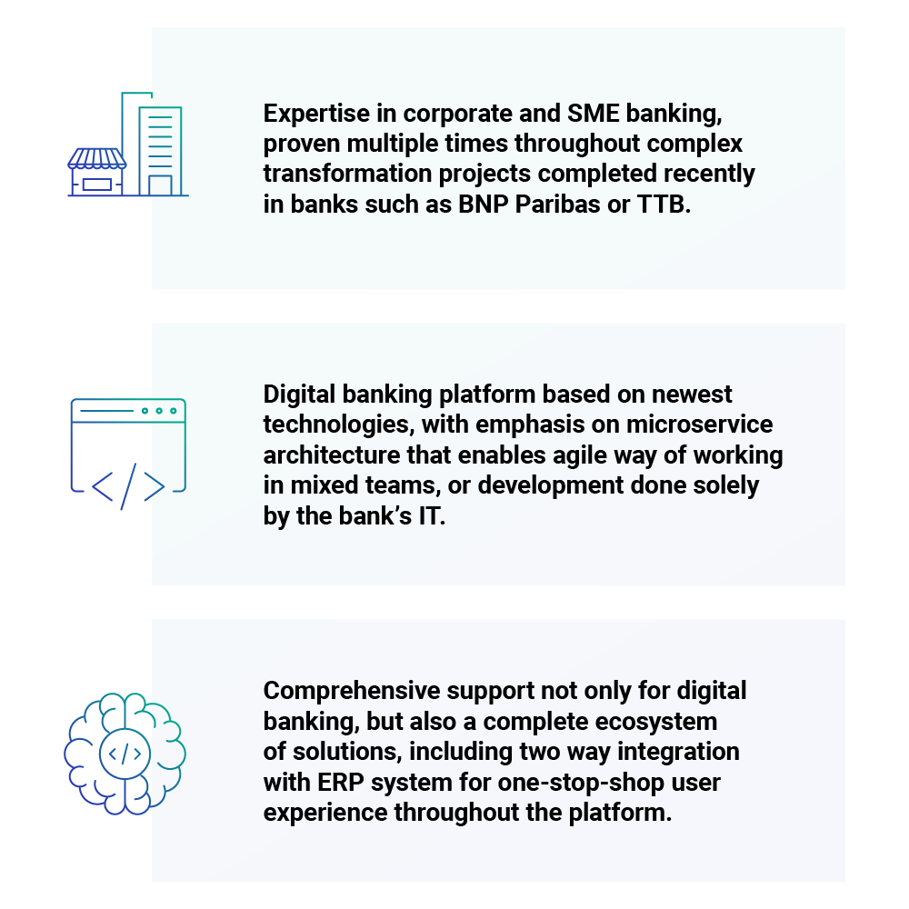 "From the first releases, the new platform allows its joint development together with the bank's IT. Thanks to the open architecture, the client has the possibility to share their own solutions on the platform."