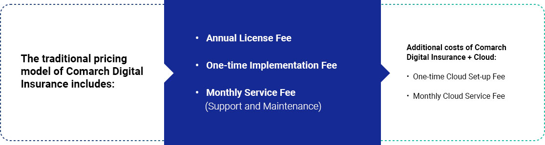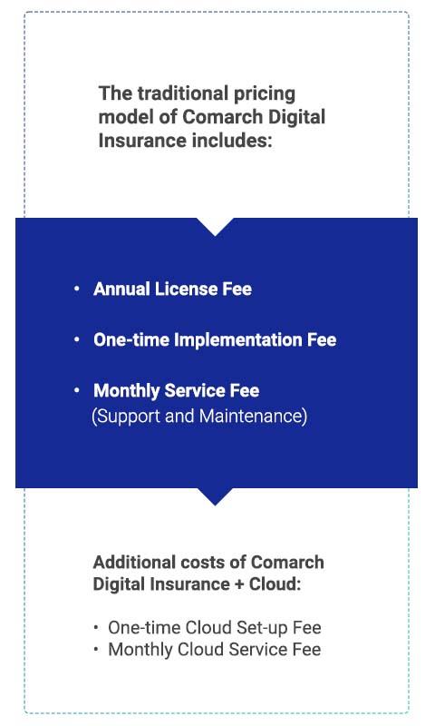 Looking for info on the types of cloud insurance pricing models? We offer the traditional kind. The final cost of implementation of Comarch Digital Insurance in the cloud depends on factors such as functional scope and the size of the company.