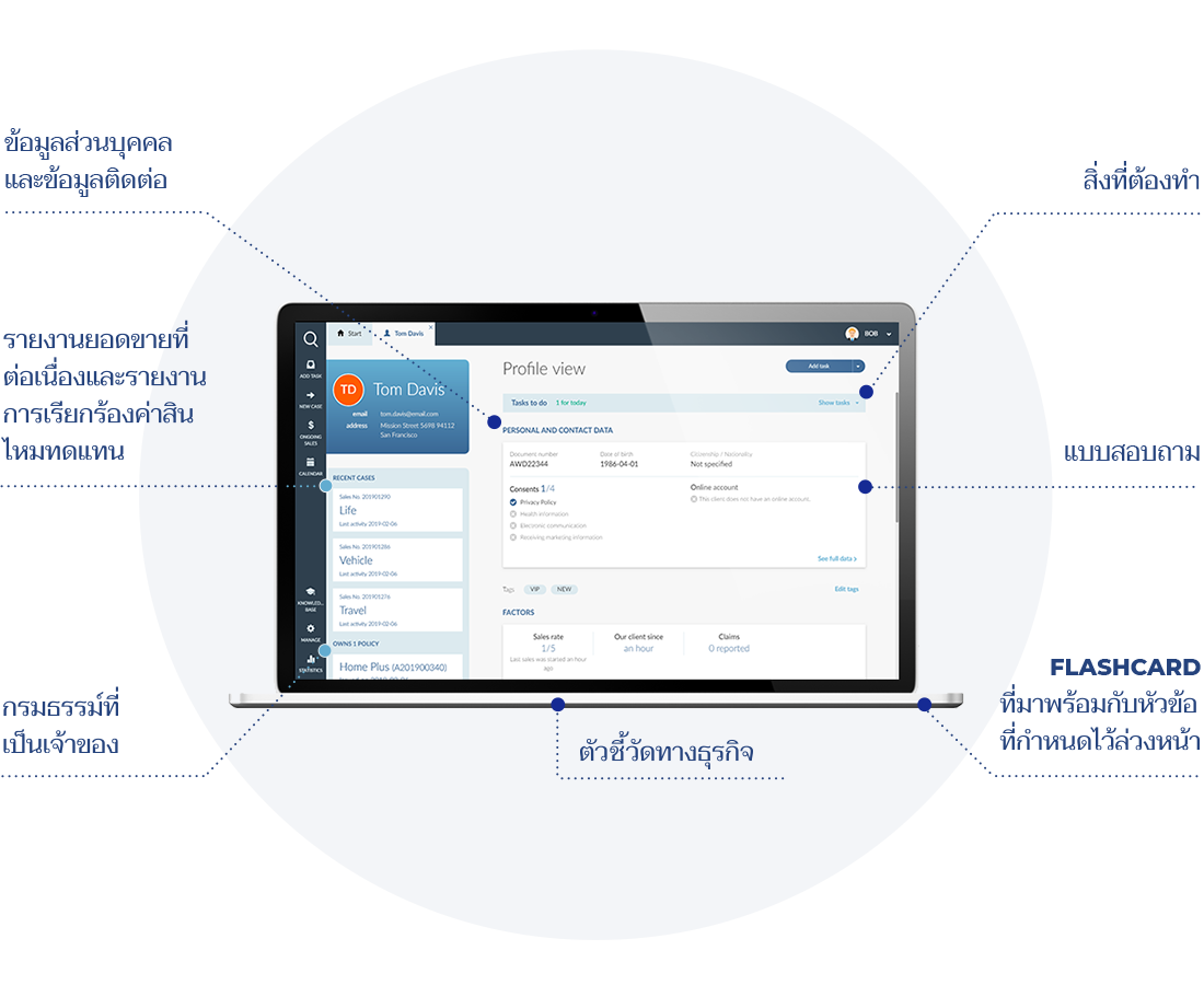 ผู้แทนจำหน่ายสามารถสร้างบัญชีลูกค้าได้อย่างง่ายดาย และสามารถบันทึกข้อมูลลูกค้าทั้งหมดและเรียกดูได้ในที่เดียว ด้วยเบราว์เซอร์ที่ใช้งานง่ายและมุมมองลูกค้าแบบ 360° ทุกบัญชีจะถูกค้นหาและใช้งานได้อย่างสะดวก ข้อมูลที่แสดงจะได้รับการปรับให้เข้ากับ กฏเกณฑ์เฉพาะของภูมิภาคของคุณ สำหรับบริษัทประกันภัย ในทวีปยุโรป แบบสอบถามเต็มรูปแบบ เช่น MiFID, PEP, FATCA หรือ การวิเคราะห์ความต้องการจะถูกรวมไว้ในที่เดียว