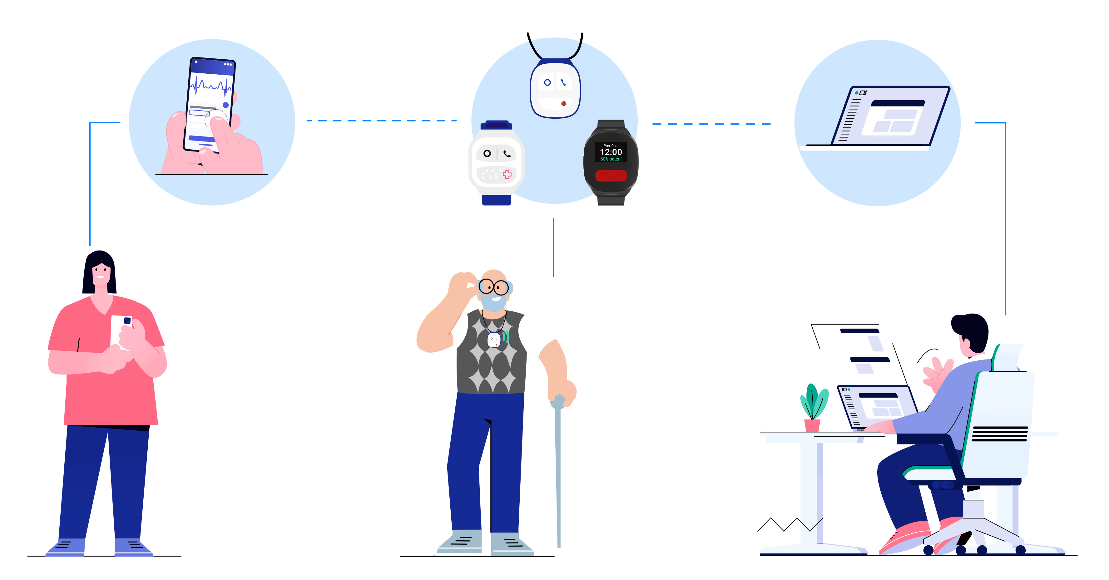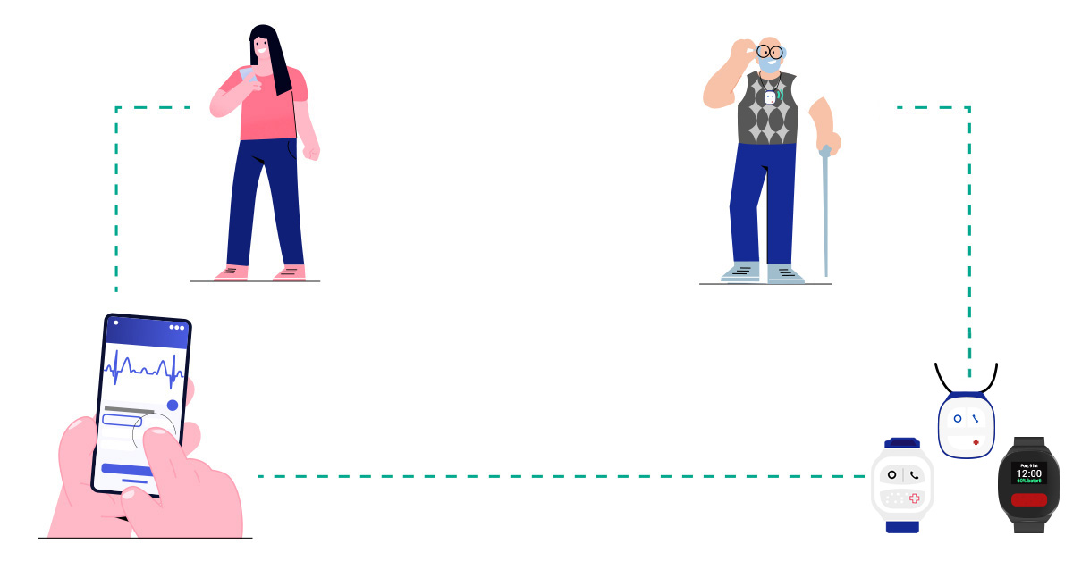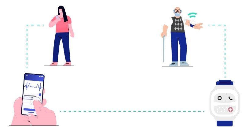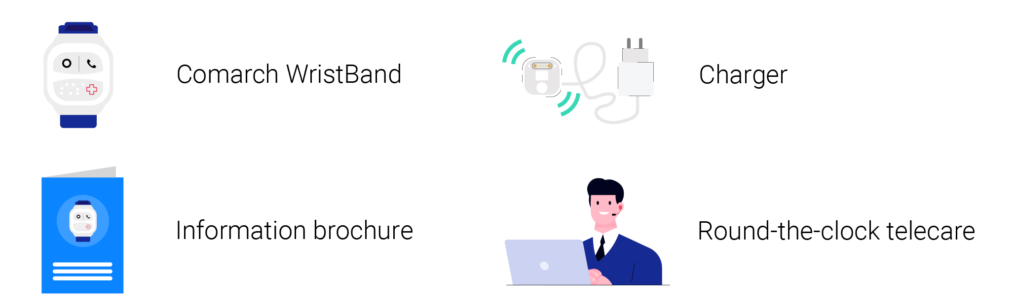 In this model, the Comarch WristBand user is under the round-the-clock care of the Remote Medical Care Centre, where qualified medical staff watches over their safety. In the event of a heart rate disorder, detection of a fall or after pressing the SOS button, rescuers contact the patient and, if necessary, send an ambulance. Relatives of the wristband wearer who use the mobile app still have access to the information collected by the device.