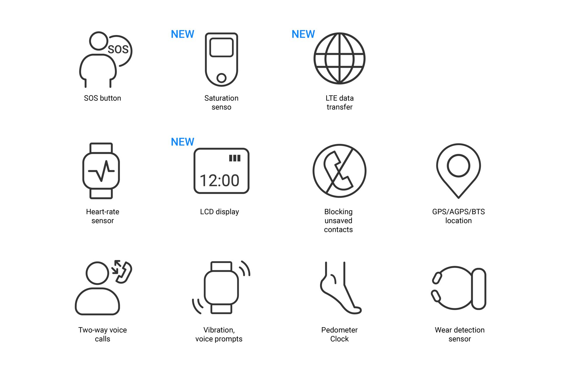 • LCD screen displaying messages (e.g., current time, low battery, network errors). The band transmits information to the application or medical rescue system via LTE network