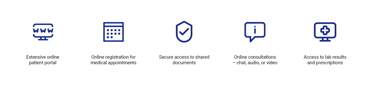 The comprehensive Patient Portal, which provides an additional route to contact a physician outside of the physician’s office. The solution provides an option of an on-line consultation on worrying symptoms or results – whether in a form of a chat, video or audio consultation, from anywhere with internet access. Register on-line for on-site visits and remote consultations, retrieve study results, and review physician prescription details.