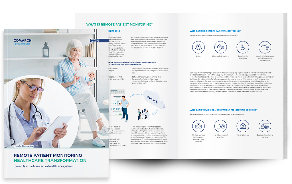 Modern telemedicine systems improve medical care and optimize costs. What’s more, they allow the provision of high-quality services in places where these were not available previously. Their advantages are countless, and their effectiveness has been repeatedly confirmed. There are many products and application models. One of the most popular and common systems is remote patient monitoring (RPM), the topic of this white paper. Comarch meets current and future healthcare market needs and has wide experience in patient telemonitoring. Selected case studies present areas of use and proposed implementation models.