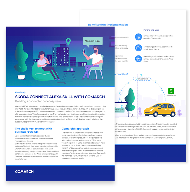 As the world and everyday life become more digitized, connected and intuitive, the most innovative technologies have entered the automotive industry to deliver the best user experience for car users. The Comarch team has worked hard on the development of Alexa Skill for ŠKODA, as a natural result of our experience gained with in-car applications (such as Alexa in-car).