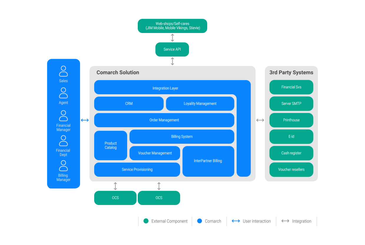 The system contains compact versions of Comarch products such as CRM, Self-care, Billing System, Product Catalog, Voucher Management, Customer Lifecycle Management, Loyalty Management, and Application Integration Framework. Smart BSS configured in this manner handles charging, invoicing and billing using a real-time rating functionality provided by the integrated OCS, and benefits from the support of authorization and service provisioning. The system provides interfaces for real-time offline and online authentication, charging and accounting through the RADIUS (RFC2865 and RFC 2866) networking protocol, SAP-integrated payment invoicing, subscription and voucher management including order tracking, balance checks, and top-ups. The Wholesale Billing product allows telecommunication support for business to business relations and settlements.