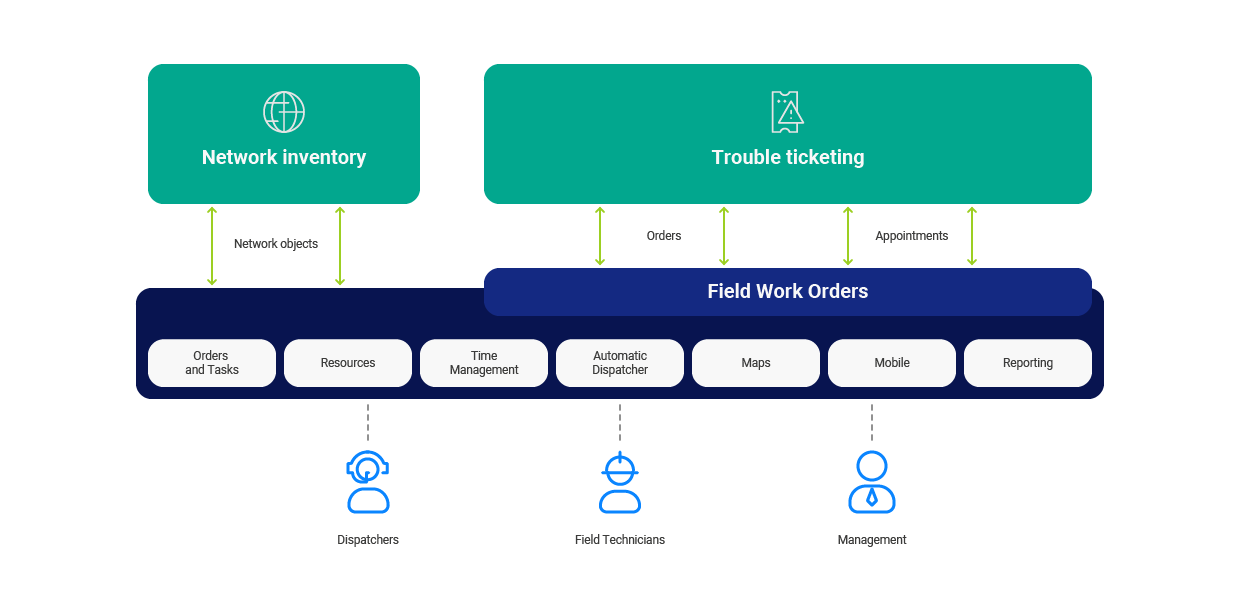 • Digital Map, to ensure optimal route planning and real-time monitoring of task locations, technicians, and network objects
