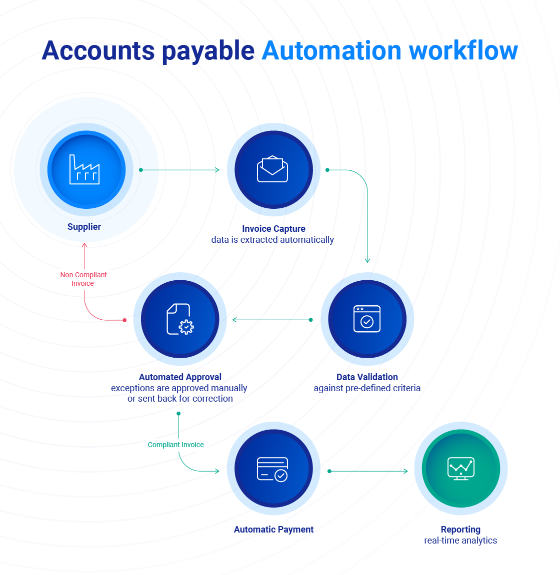 - The automation process includes capturing invoices, validating data, routing for approval, making payments, and generating reports