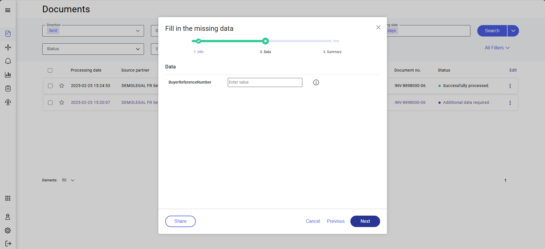 - The user manually adds the missing Buyer Reference Number and sends the invoice for further processing.