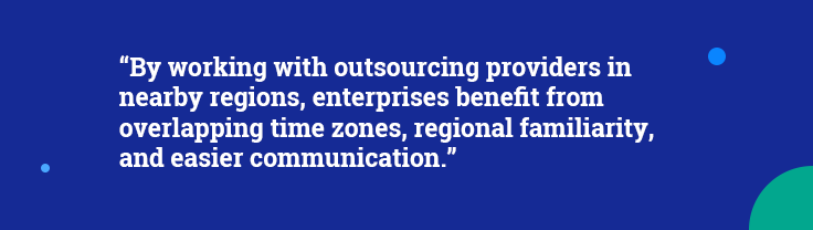 Offshoring may seem cost-effective, but it’s also riskier. A long-distance partnership may lead to delays, hidden costs, and weaker oversight. Meanwhile, nearshoring strikes a balance between cost savings and close collaboration. By working with outsourcing providers in nearby regions, enterprises benefit from overlapping time zones, regional familiarity, and easier communication.