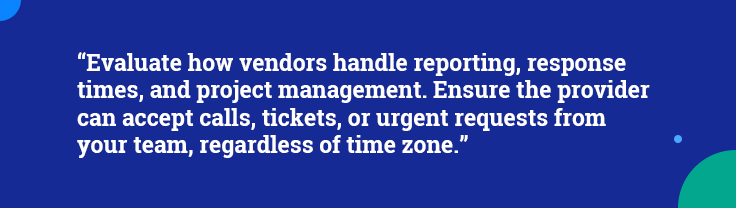 Strong communication practices are the foundation of a successful partnership. Evaluate how vendors handle reporting, response times, and project management. Ensure the provider can accept calls, tickets, or urgent requests from your team, regardless of time zone. Transparent communication builds trust and reduces the risk of misalignment. If a potential partner is slow to respond during early discussions, it may indicate future challenges in collaboration.