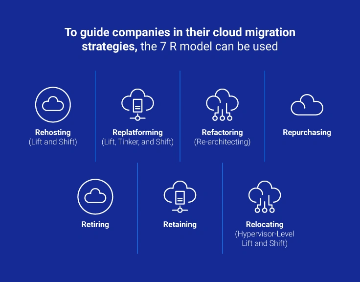 To guide companies in their cloud migration strategies, the 7 R model can be used. It categorizes various approaches to migrating applications and data to the cloud, helping businesses determine the best method for each workload.
