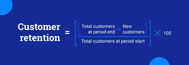 - Customer retention = [(Total customers at period end - New customers) / Total customers at period start] * 100